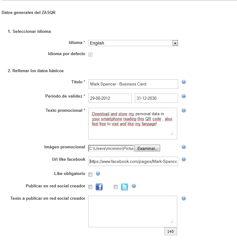 Haz clic en la imagen para ver a tamaño completoAparecerá el formulario de alta del código QR, ahora seleccionar el idioma por defecto (os aconsejamos el inglés, ya que el idioma por defecto es el idioma que el lector utilizará en el caso en que el código QR no se haya definido en el idioma de la persona que lea el código).