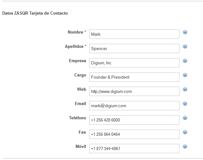 En la parte inferior de la pantalla están los datos de contacto. Completa la información con tus datos, nombre, apellidos, teléfono, email, etc. Indica los datos tal como quieres que aparezcan en el móvil, evitando en la medida de lo posible caracteres especiales que pueden generar problemas; por ejemplo paréntesis en los números de teléfono.