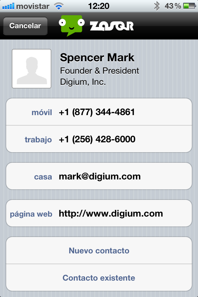 Haz click en la imagen para ver a tamaño completoY si confirmas la lectura verás los datos de contacto de Mark Spencer listos para añadir a un contacto de tu móvil o para agregar a un contacto nuevo.